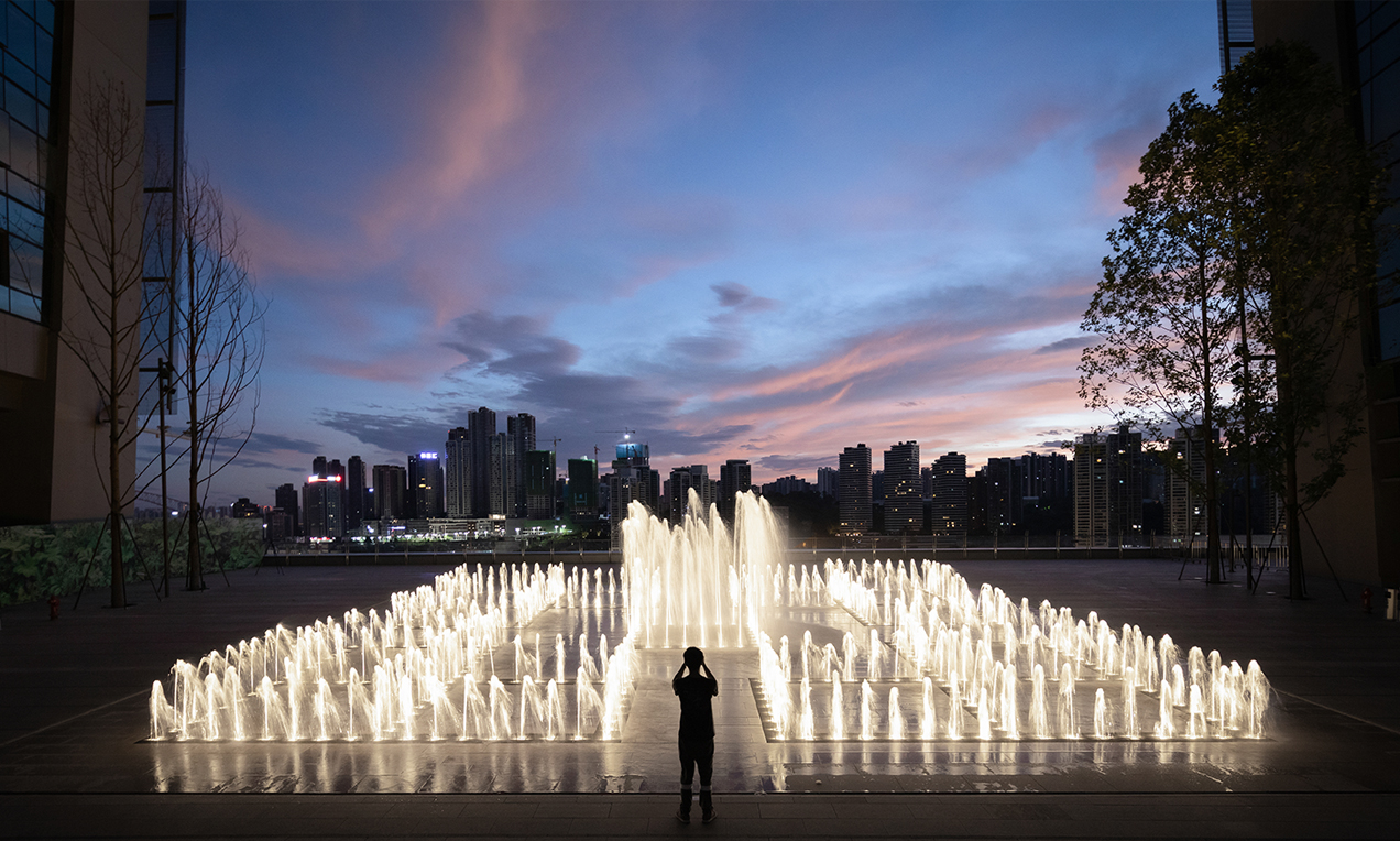 水本無(wú)形,它的物理特性讓它能輕易地跟隨容器而呈現(xiàn)不同的面貌。獨(dú)特的延展性使得水能呈現(xiàn)無(wú)以計(jì)數(shù)的不同效果。燈光的布置,介質(zhì)的紋理,顏色和動(dòng)態(tài)都能給水帶來(lái)無(wú)窮的變化。